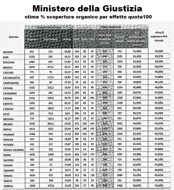 Stima scoperture organico per la "quota 100" e accelerazione assunzioni nella Giustizia